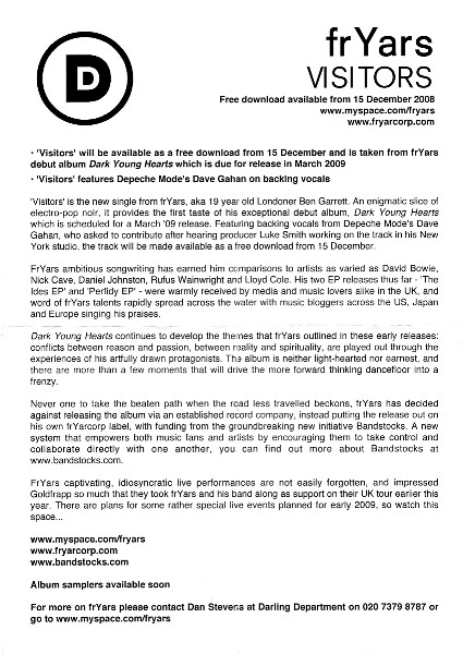 "Visitors' Is the new single from trYars, aka 19 year old Londoner Ben Garret 4n enigmatic sice nt eleciro-pop noir. it: provides the tirst taste ot his exceptional debut album, Dark Young Hearts which is schedluled fior a March '09 release. Festuwing backing vocals trom Depache Mode's Dave Gahan, who asked 10 contribute after hearing prodlucer Luke; Smith working on ithe track in his Ne York studio,. the track wil be made availabile as a free download from 15 December.