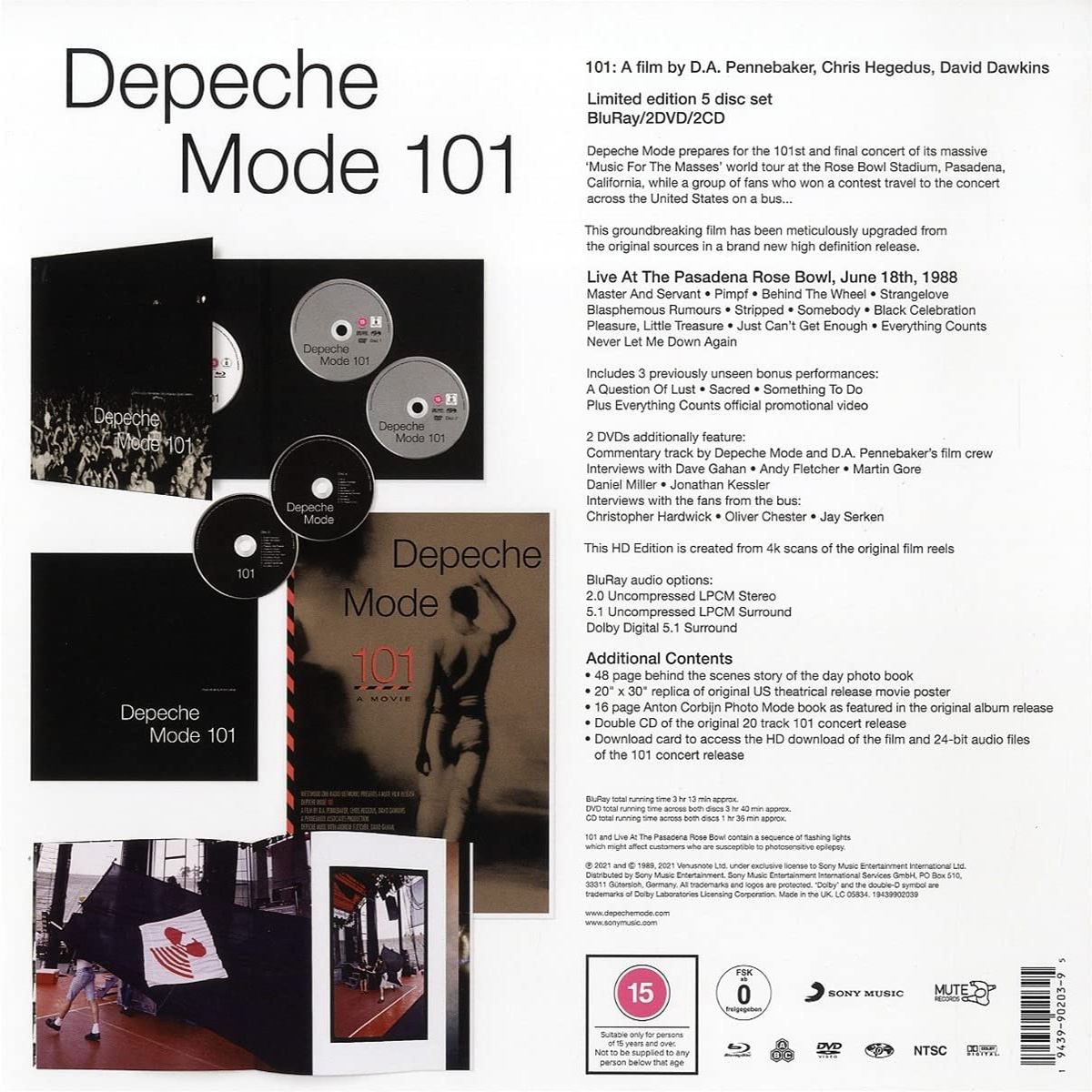 Additional contents in the new, limited edition Depeche Mode 101 box set include: a 48 page behind-the-scenes story of the day photo book; a 20" x 30" replica of original US theatrical release movie poster; a 16 page Anton Corbijn Photo Mode book as featured in the original album release; a double CD of the original 20 track 101 concert release; and a Download Card providing access to 4K downloads of the film and bonus performances plus 24-bit audio files of the 101 concert release. The two DVDs in the set contain the original extras from the 2003 DVD release of Depeche Mode - 101, which are exclusive to the DVD discs.