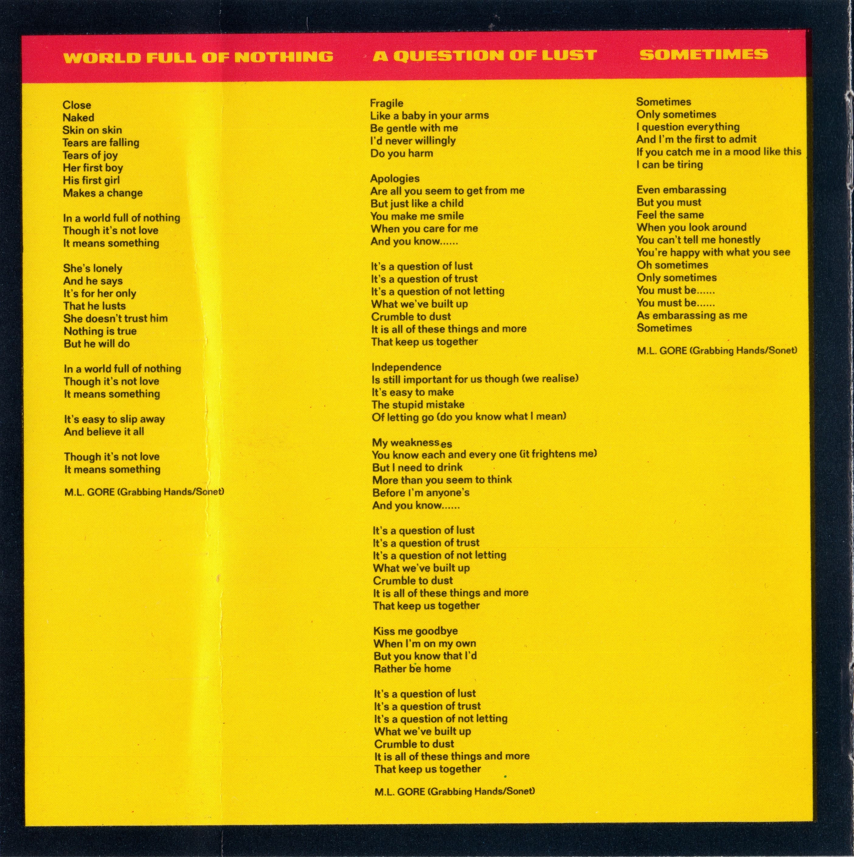 "A Question Of Lust" 04:20 • Produced by Depeche Mode, Gareth Jones and Daniel Miller. Assistant Engineers - Richard Sullivan (Westside, London) and Peter Schmidt (Hansa, Berlin). Mastered by Tim Young.