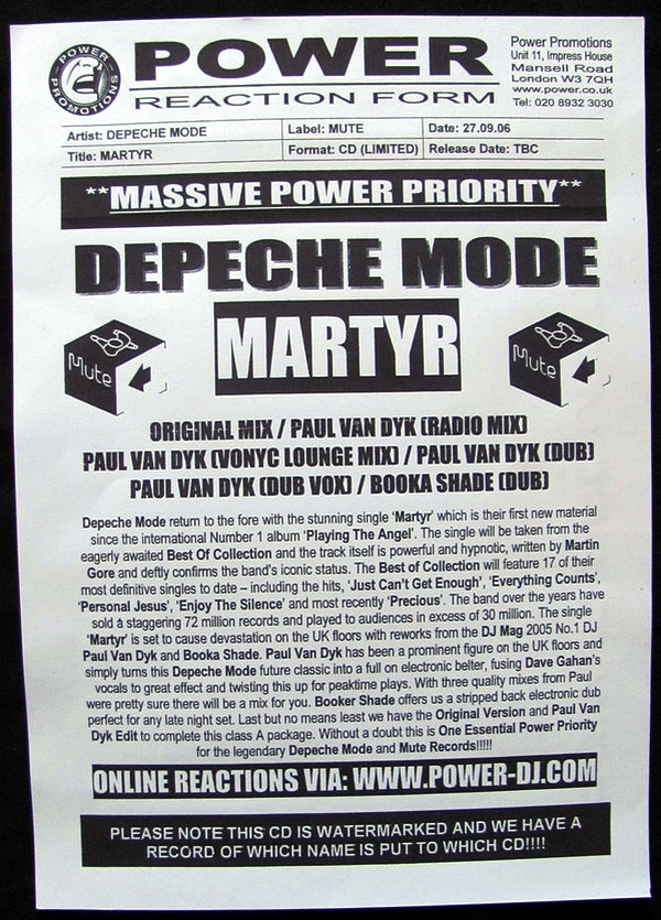 "Martyr" (Radio Edit) 03:07 • Produced by Ben Hillier for 140db. Mixed by Jeremy Wheatley for 365 Artists at Twenty-One Studios. Assisted by Richard Edgeier. Programming by Dave McCracken, additional programming by Richard Morris. Engineered by Ben Hillier and Richard Morris.