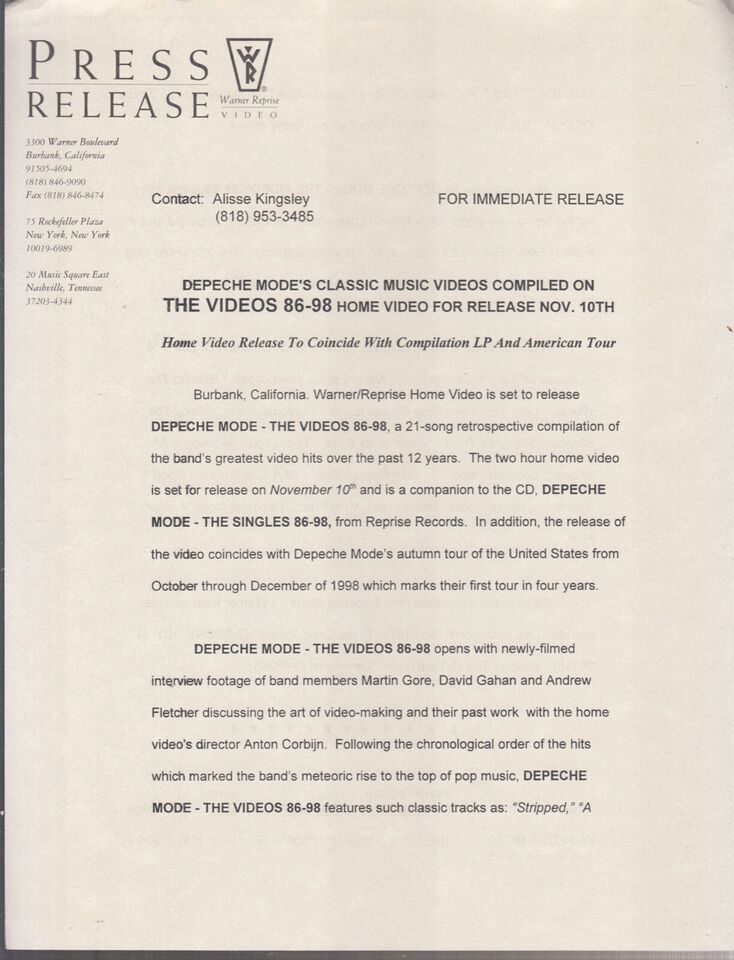 Released to coincide with Depeche Mode's fall American tour - their first in four years and the new double - CD / cassette anthology "The Singles 86>98", this new home-video anthology brings together every single video clip Depeche Mode have made in the past 12 years. More than two hours long and featuring 21 of the most visually stunning music videos ever made. "The Videos 86>98" is a must-have item for any Depeche Mode fan.